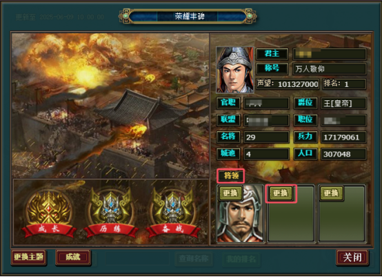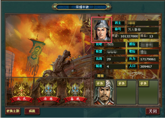 玩家可以在【将领】处点击【更换】选择自己心仪的将领进行展示。也可以不进行将领展示。