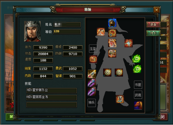 点击当前玩家展示的将领头像后可查看该将领的装备及特长界面。