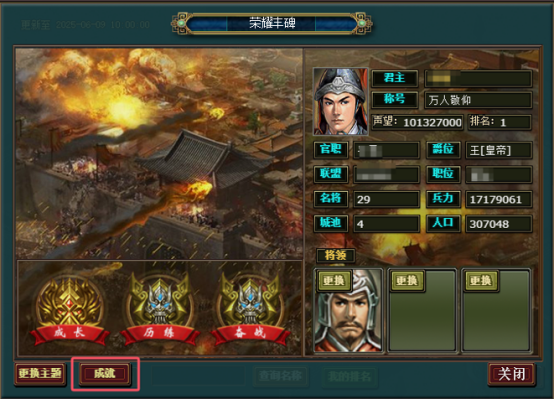 玩家也可以在排行榜的【君主将】及【玩家】排行榜中点击查看其他玩家的【荣耀丰碑】。