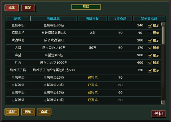 玩家可以通过完成成长、历练、奋斗中的各种成就获得不同的荣誉点数。玩家可选择在个人信息面板展示目前已获得的成就。