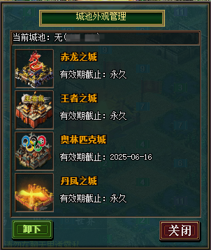 版本上线后,玩家可对除特殊城池(名城、不落之城)之外的城池使用多种城池皮肤,通过城池外观管理自由切换当前城池皮肤。也可在此界面卸下城池皮肤。限时皮肤将在有效期截止后自动消失。
