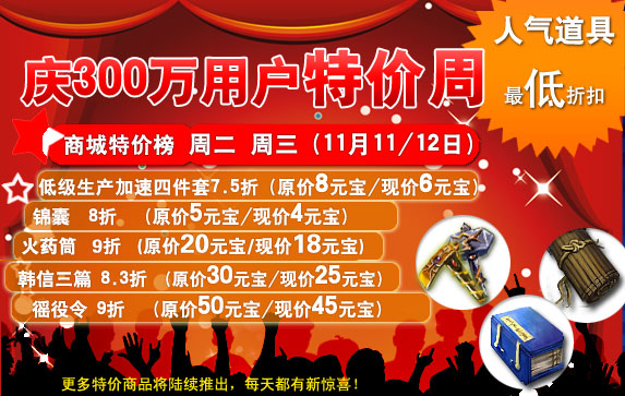 活动期间,游戏商城每天都将安排不同的道具进行打折销售,人气道具最低折扣回馈玩家