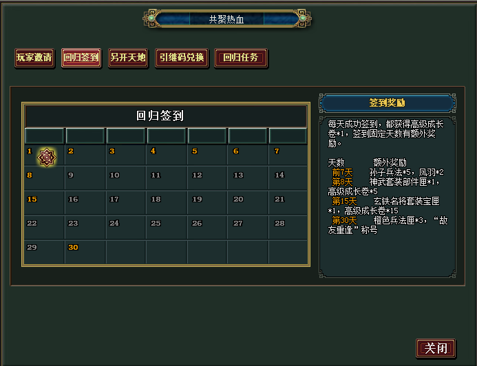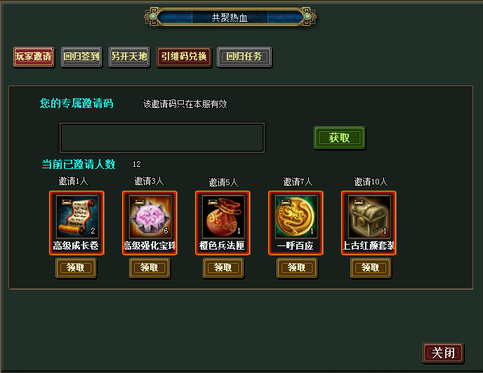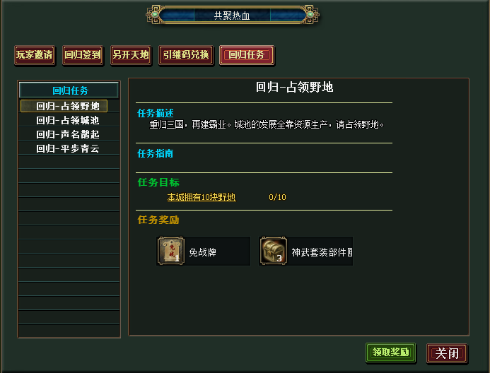 2)其中【回归任务-决战天下】需要回归时君主等级已达到40级的玩家才能获取该任务。当回归玩家领取【回归任务-决战天下】的奖励后,若回归玩家是通过填写邀请码的方式回归,则该邀请玩家可获得200礼金,通过邀请其他玩家,玩家最多可通过放方式获得20次奖励。200礼金通过游戏内信件发放。