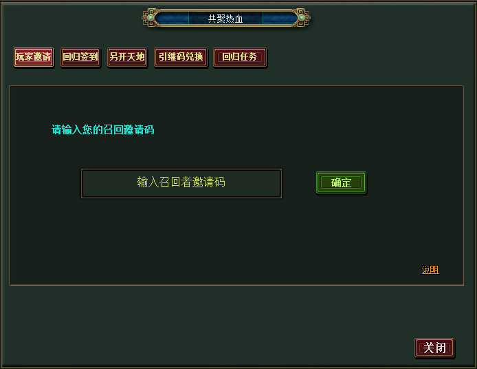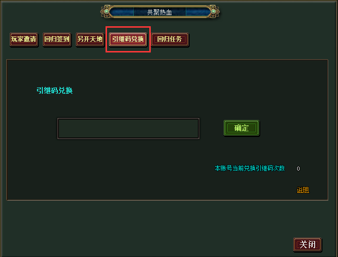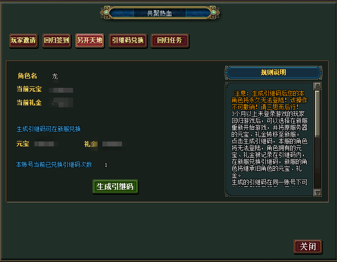 1)点击“生成引继码”后本服的角色将无法登陆,玩家可在新服兑换引继码,兑换成功后新服的角色将继承旧角色的元宝、礼金。